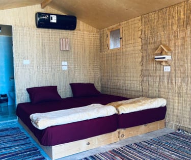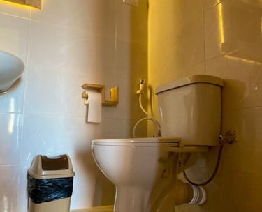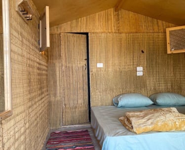 Bungalónk közös fürdőszobával és VENTILÁTORRAL. A közös fürdőszobához privát kabinok tartoznak egy szanatóriumi blokkban.